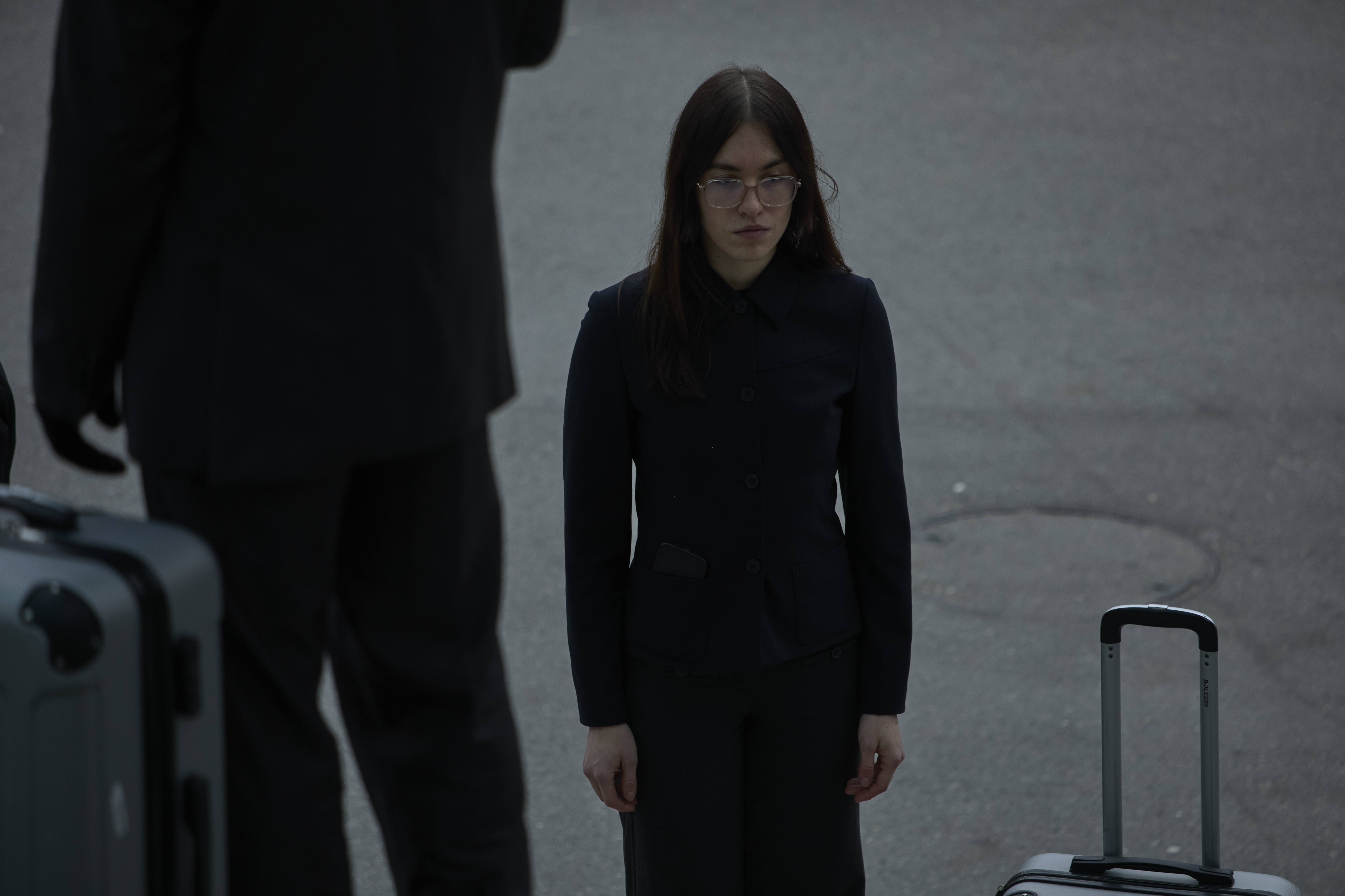 9 performers, saxophone player, corporate dress code, choreography, suitcases, coffee cups, lunch food, iPhones,